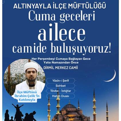 Her Perşembeyi Cumaya bağlayan gece yatsı namazından önce, Dirmil merkez Camii'nde İlçe Müftümüz Sn. İbrahim Çelik'in sohbetleriyle, Yasin suresi, Tevbe-İstiğfar ve dualarla yapılacak olan programa tüm halkımız aileleriyle birlikte davetlidir.